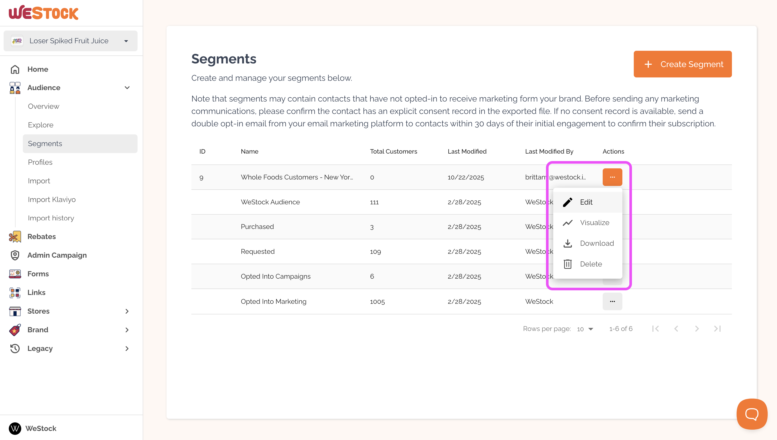 - The Segment will now be listed on the Segments page. Click the [...] menu to display actions for the segment: